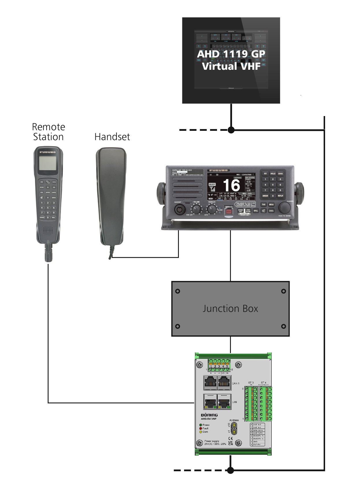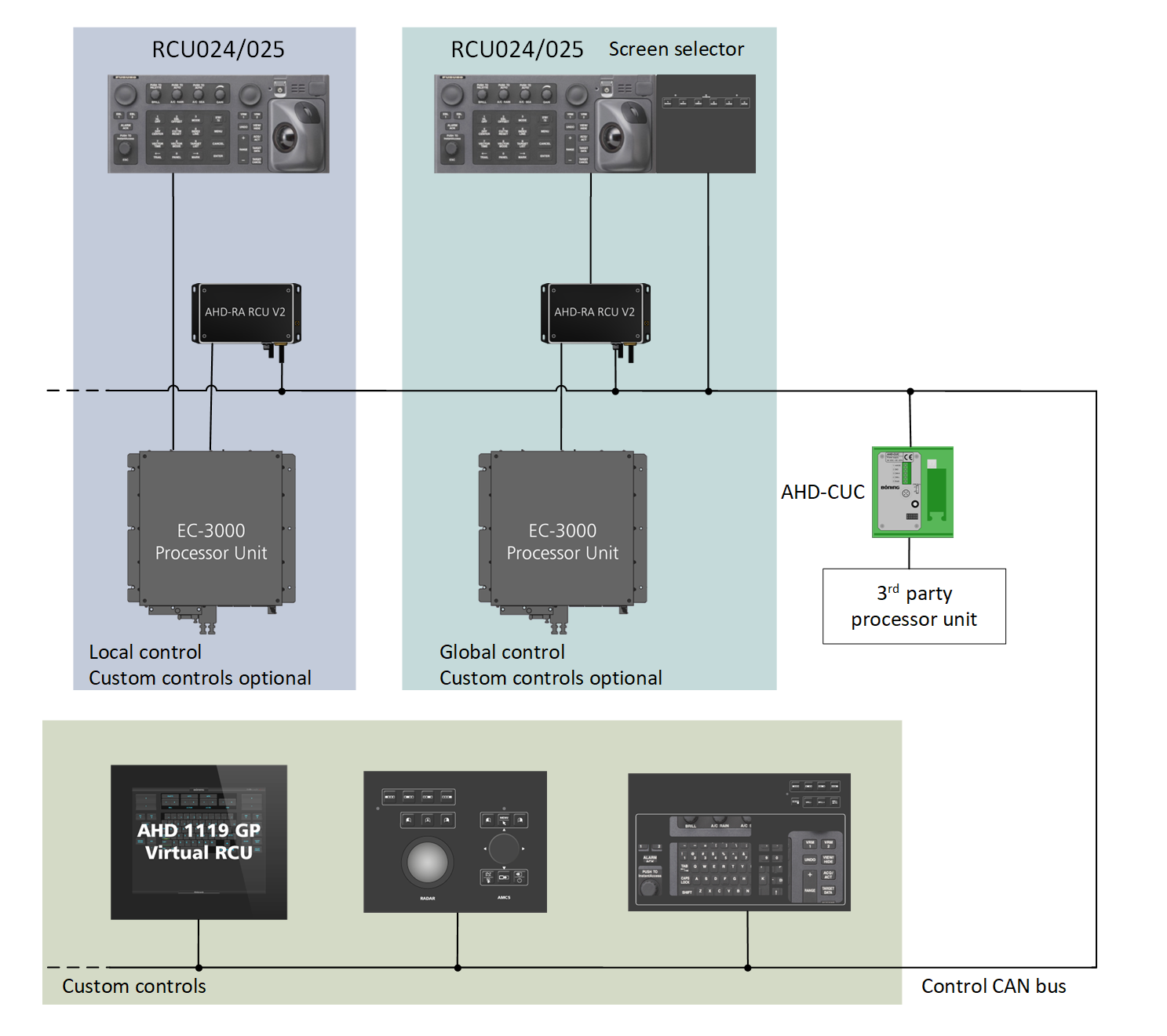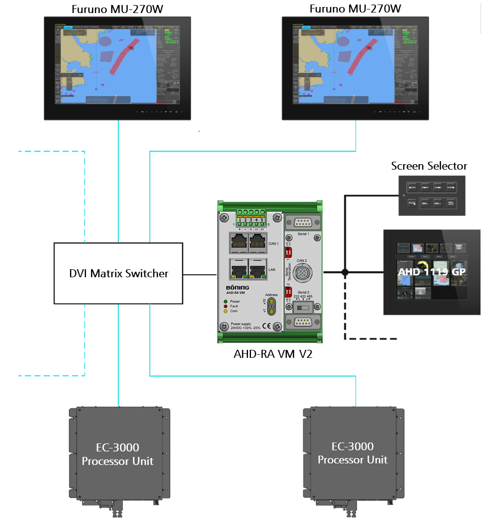Das Böning Matrix System Multiview fasst eine Vielzahl von Funktionen wie Radar, Navigationssysteme, AMCS und mehr in einer gemeinsamen Visualisierung zusammen. Es bietet ein multifunktionales Bedienkonzept, das sowohl über Touchscreen-gesteuerte Displays als auch über kundenspezifische Bedienelemente wie Tastaturen, Trackballs und Fernsteuerungen bedient werden kann. Die Bedienkomponenten sind nahtlos im Brückenpult integriert und ermöglichen eine benutzerfreundliche Steuerung aller Systeme. Im Falle eines Ausfalls einer Fernsteuer-Komponente kann der „Direct Mode“ aktiviert werden, sodass grundlegende Funktionen weiterhin verfügbar bleiben. Zu den wichtigsten Automatisierungs- und Navigationsfunktionen gehören ECDIS, Radar, VHF, Autopilot sowie optionale Funktionen wie Videoüberwachung und Datenlogging.
