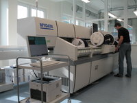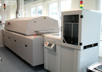Dal 2007, abbiamo attivato la nostra linea di produzione SMD che ci permette di montare i cosiddetti dispositivi a montaggio superficiale professionalmente. Il processo di produzione inizia già con la corretta e standardizzata conservazione dei componenti SMD sensibili. Le parti necessarie sono prelevate dal cosiddetto sistema di stoccaggio a secco (dry-storage) e forniti alla macchina per il montaggio (placement) su scheda: tale macchina, tra le più avanzate sul mercato, riesce a piazzare fino a 350 pezzi al minuto sulla scheda a circuito stampato (PCB – printed circuit board) con una precisione migliore di un centesimo di millimetro. Prima del posizionamento, su ogni PCB è distribuita la pasta saldante che crea la connessione durante le fasi successive del processo di saldatura. La macchina distributrice della pasta saldante utilizzata in questo processo è anch’essa uno strumento di precisione, che applica il velo di pasta nello spessore e la consistenza giusta. Dopo l'ispezione visiva, tutti i moduli completamente equipaggiati sono avviati al processo di saldatura.